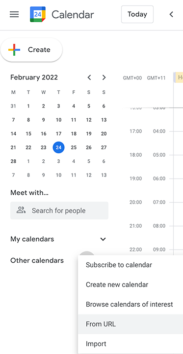 Open Google Calendar - in the left sidebar menu select the +next to "Other Calendars" and select "From URL"