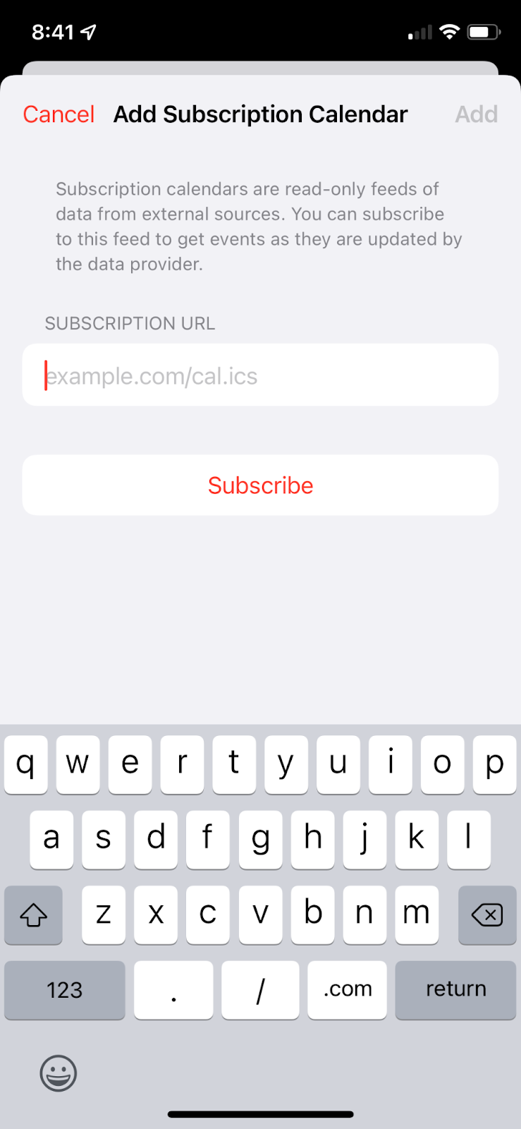 In the Subscription URL field, paste the LeaveCal .ics link you saved earlier to your clipboard. Then press ‘Subscribe’