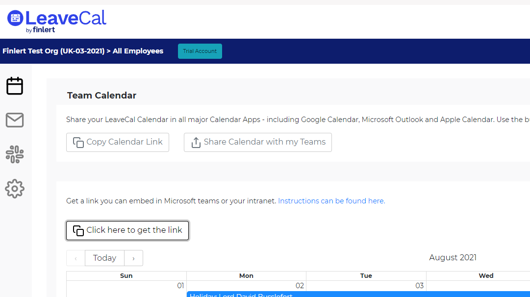 Within the LeaveCal console select the ‘Click here to get the link’ button. This will get you a HTML version of your LeaveCal