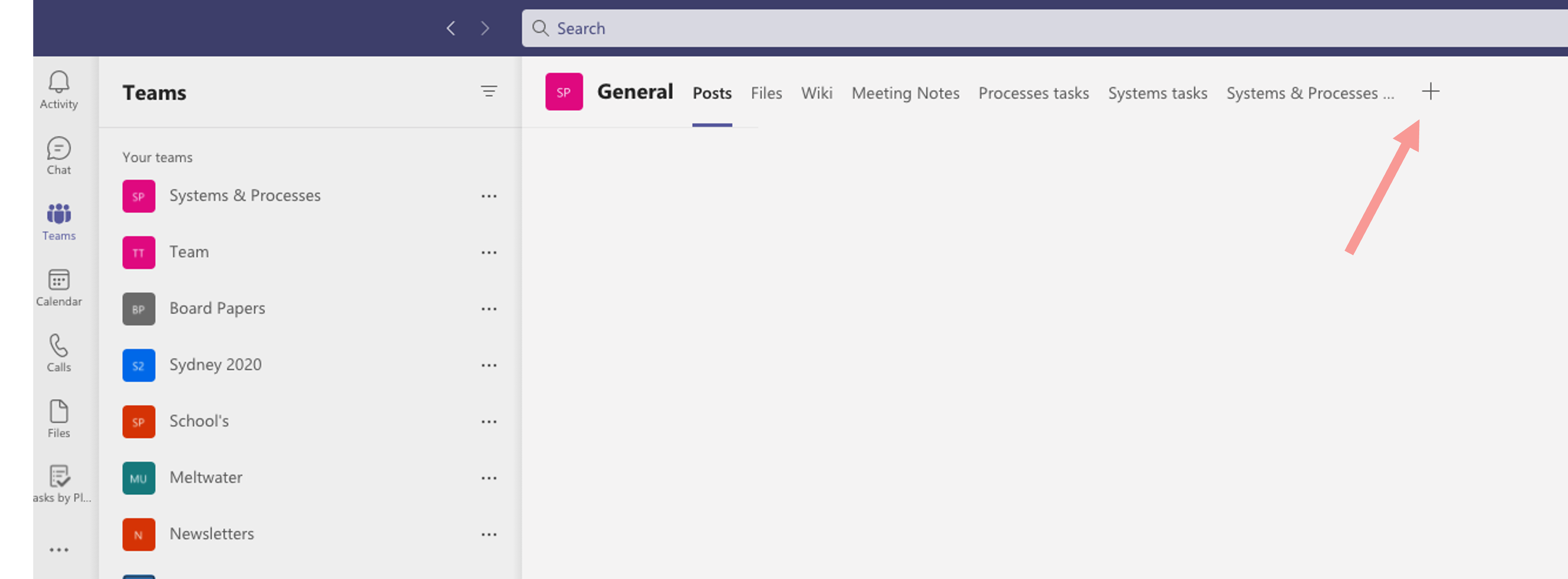 Log into your Microsoft Team where you wish to display your Calendar. Select the + button on the right hand side