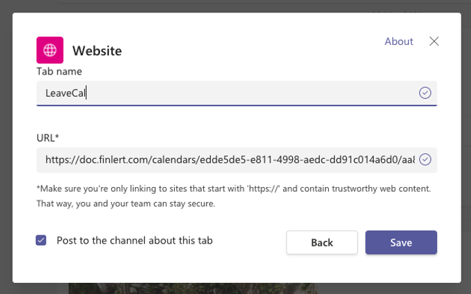 Enter a name for your new tab and paste the link you coped from the LeaveCal console