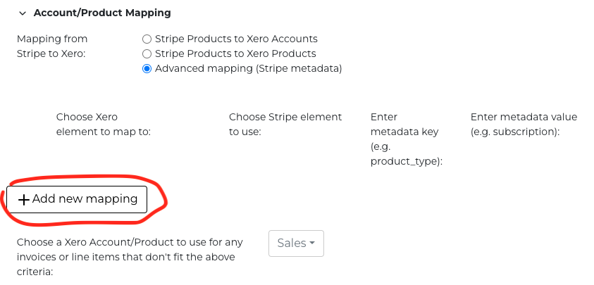 Advanced Mapping (Stripe metadata) - If you have a high volume of products in Stripe and/or you are using or are familiar with Stripe Metadata the advanced mapping feature will allow you to automatically allocate invoices to Xero Accounts or Xero Products & Services based on the metadata stored in Stripe against Invoices, Subscriptions and Products.